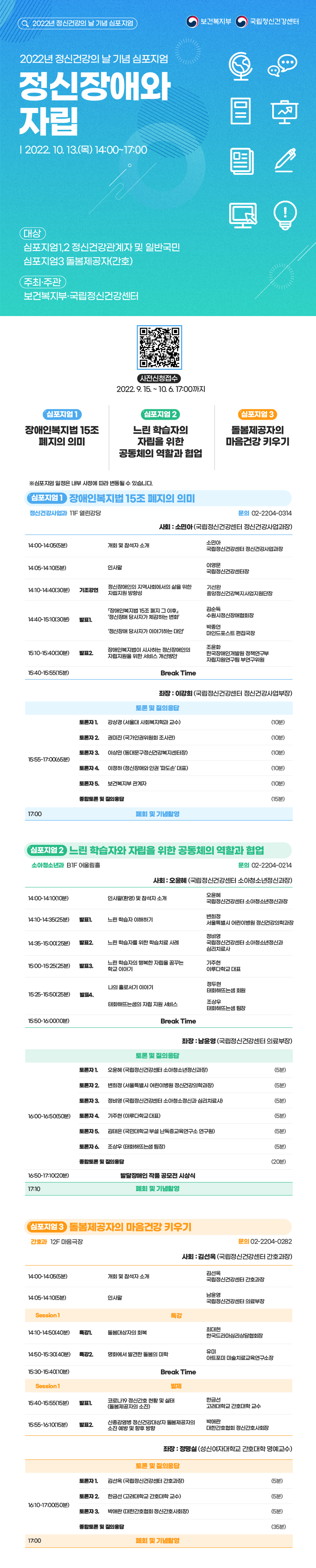 국립정신건강센터에서는  2022년 정신건강의 날을 기념하여 「정신장애와 자립」이라는 주제로 심포지엄을 개최합니다.  많은 관심과 참여 부탁드립니다.