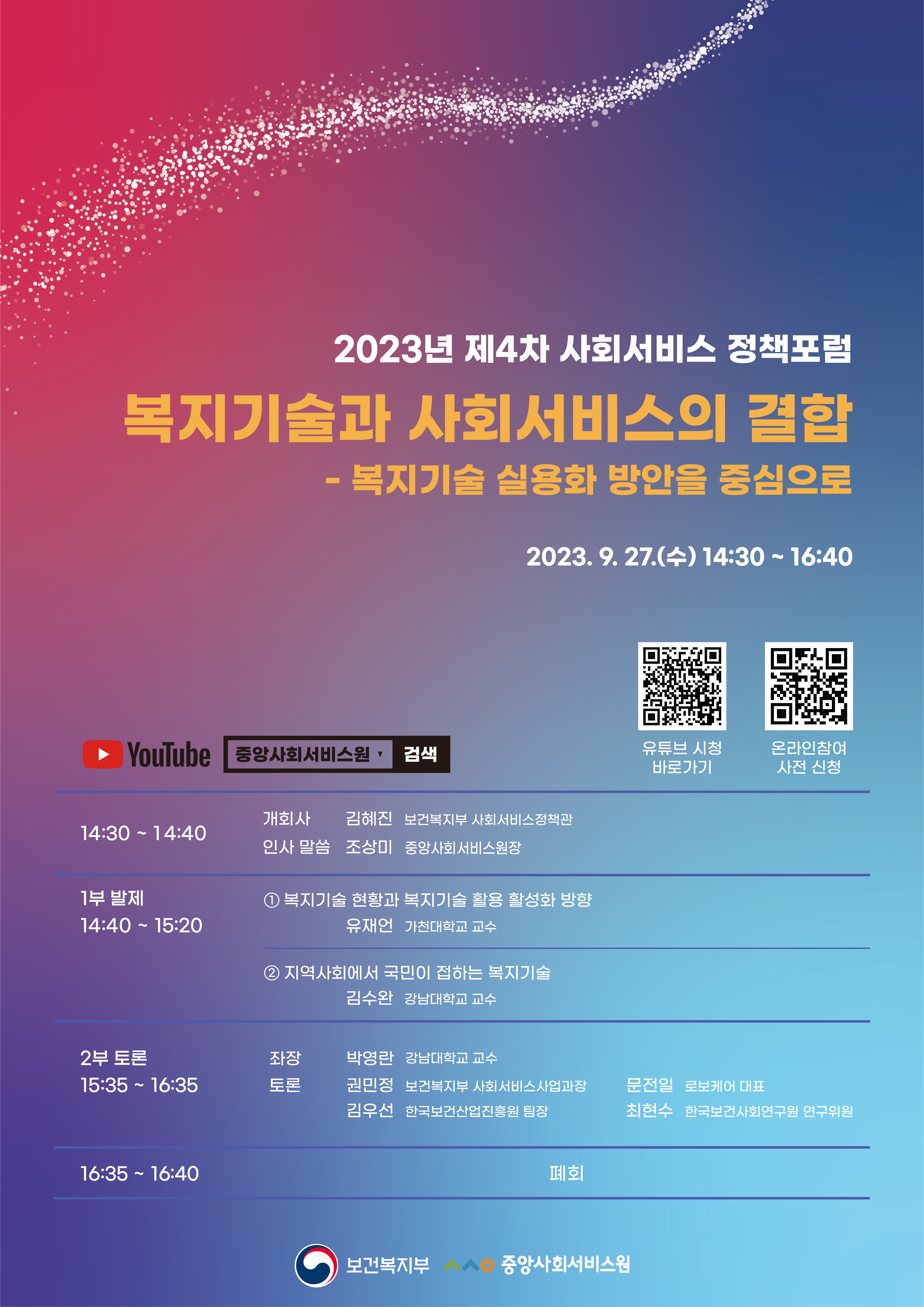 이번 포럼은 2023. 9. 27.(수) 14:30~16:40 까지 개최되며, 중앙사회서비스원 유튜브 계정으로 실시간 송출됩니다.