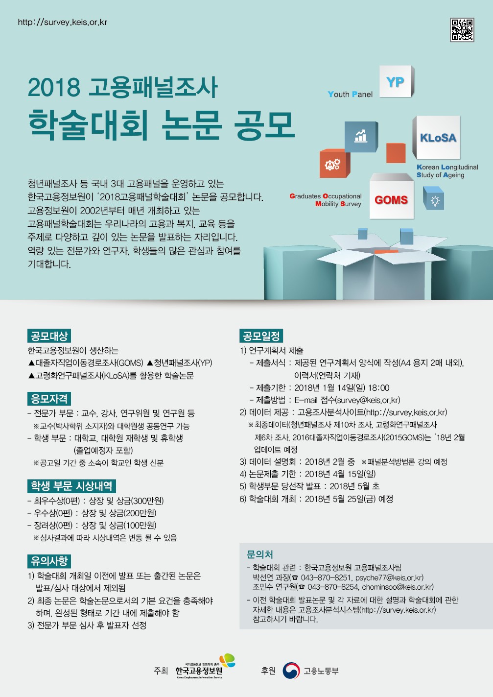 한국고용정보원은 ‘청년패널조사(Youth Panel)’, ‘고령화연구패널조사(Korean Longitudinal Study of Aging)’, ‘대졸자직업이동경로조사(Graduates Occupational Mobility Survey)’를 실시하고 있습니다. 현재 ‘청년패널조사(YP2007)’ 제1차~제9차년도 조사, ‘고령화연구패널조사(KLOSA)’ 제1차~제5차년도 조사, ‘2006~2015대졸자직업이동경 로조사’(2011GOMS부터 횡단면조사로 변경)를 제공하고 있으며, 2018년 2월(예정)에 청년 패널조사 제10차년도 조사, 고령화연구패널조사 제6차년도 조사, 2016대졸자직업이동경로 조사(2015GOMS)를 공개(최종데이터)할 예정입니다. 한국고용정보원은 우리나라 노동시장의 고용과 임금구조, 청년층 및 대학졸업자의 학교에 서 직업세계로의 이행에 관한 연구를 활성화하고, 더 나아가 청년 및 고령자 고용, 직업훈 련, 직업상담 및 취업알선 등 고용정책 수립에 관한 정책방향을 제시하고자 지난 2002년부 터 매년 학술대회를 개최하고 있습니다. 현재 제공되는 자료 및 2018년 2월(예정)에 공개 될 자료를 활용한