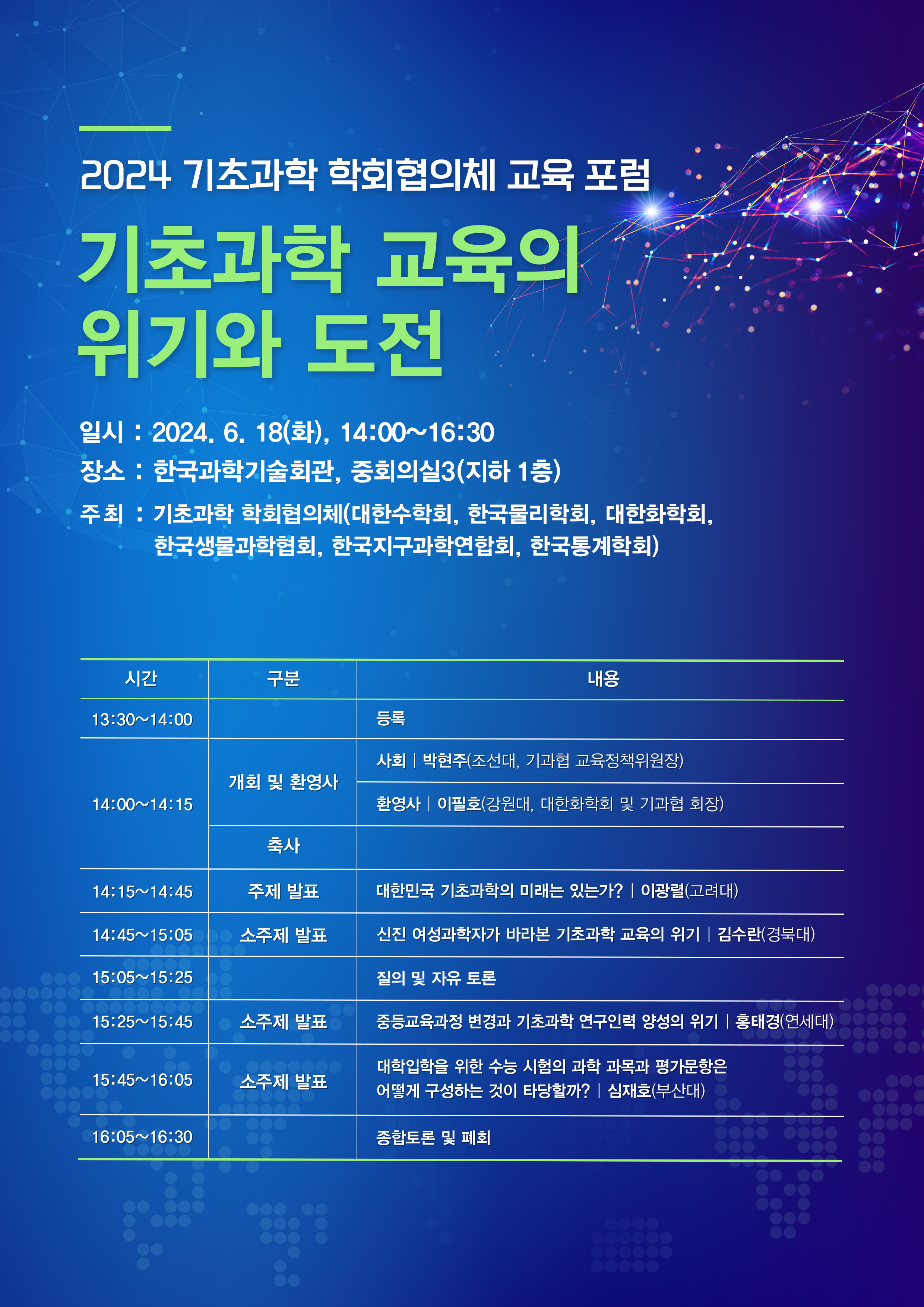 2024년 기초과학 학회협의체 교육 포럼이 아래와 같이 개최됩니다. ◾ 일시: 2024년 6월 18일 오후 2시