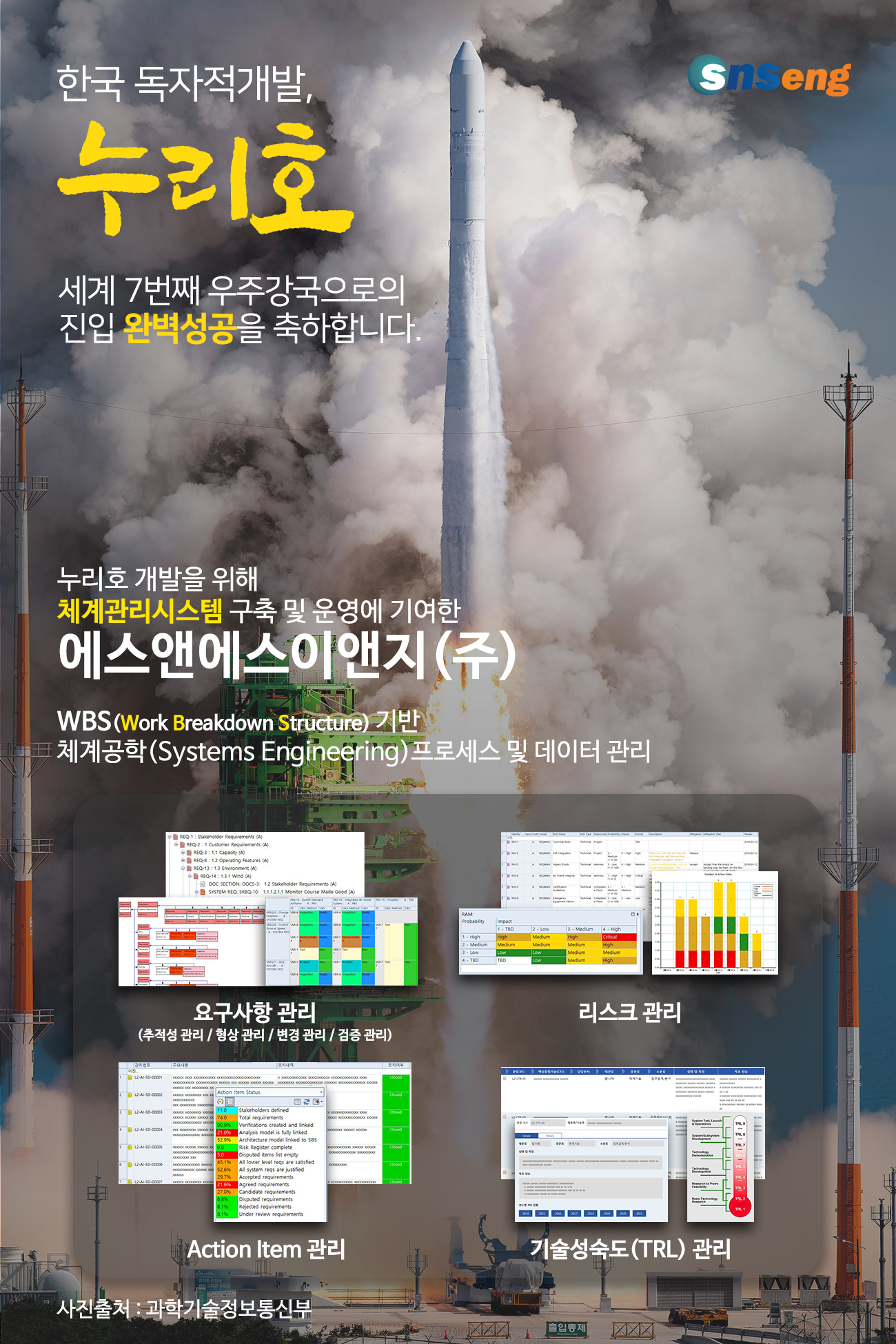 에스앤에스이앤지()2015년을 시작으로 항공우주연구원과의 계약을 통해 당사에서 공급하고 있는 시스템엔지니어링 솔루션 Cradle을 활용하여 누리호 개발사업에서의 체계관리 데이터(WBS(Work Breakdown Structure, 요구사항 등)을 수집/관리/공유하기 위한 통합체계관리시스템(ISMS : Integrat Systems Engineering System)을 구축 및 운영하였습니다.