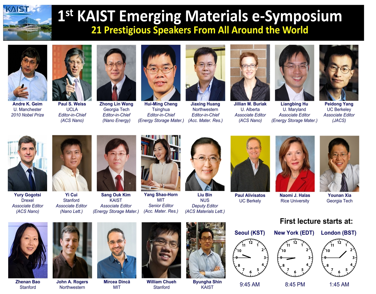 It is a great pleasure to welcome you at the 1st KAIST Emerging Materials Symposium, held on September 21-25, 2020 via Online Zoom presentation.