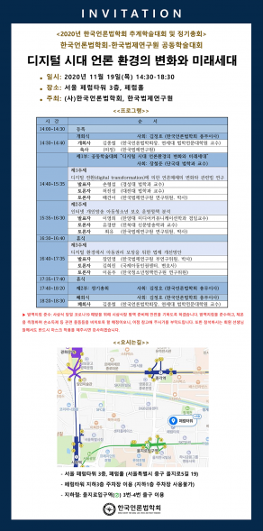 일전에 예고드렸던 바와 같이, 돌아오는 11월 19일(목)에 2020년 한국언론법학회 추계학술대회 및 정기총회를 개최할 예정입니다. 장소 섭외에 난항이 있어 이제야 구체적 장소를 공지하게 되어 송구하다는 말씀드립니다.