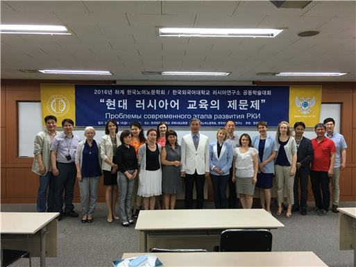 2016 년 6 월 10 일( 금)~11 일( 토) 러시아연구소 HK 연구사업단은 인문한국 프로젝트( 아젠다: 러시아연방 인문공간의 한국적 재구성) 학술활동의 일환으로 본교 글로벌캠퍼스 국제사회교육원 407 호에서 한국노어노문학회와 공동 학술대회를 개최했다. “ 현대 러시아어 교육의 제문제” 라는 주제로 기획된 이번 공동 학술대회는 이틀에 걸쳐 3 개 세션에 외국인 교수 14 명과 국내 학자 4 명 등 총 18 명이 17 개의 연구논문을 발표했다.