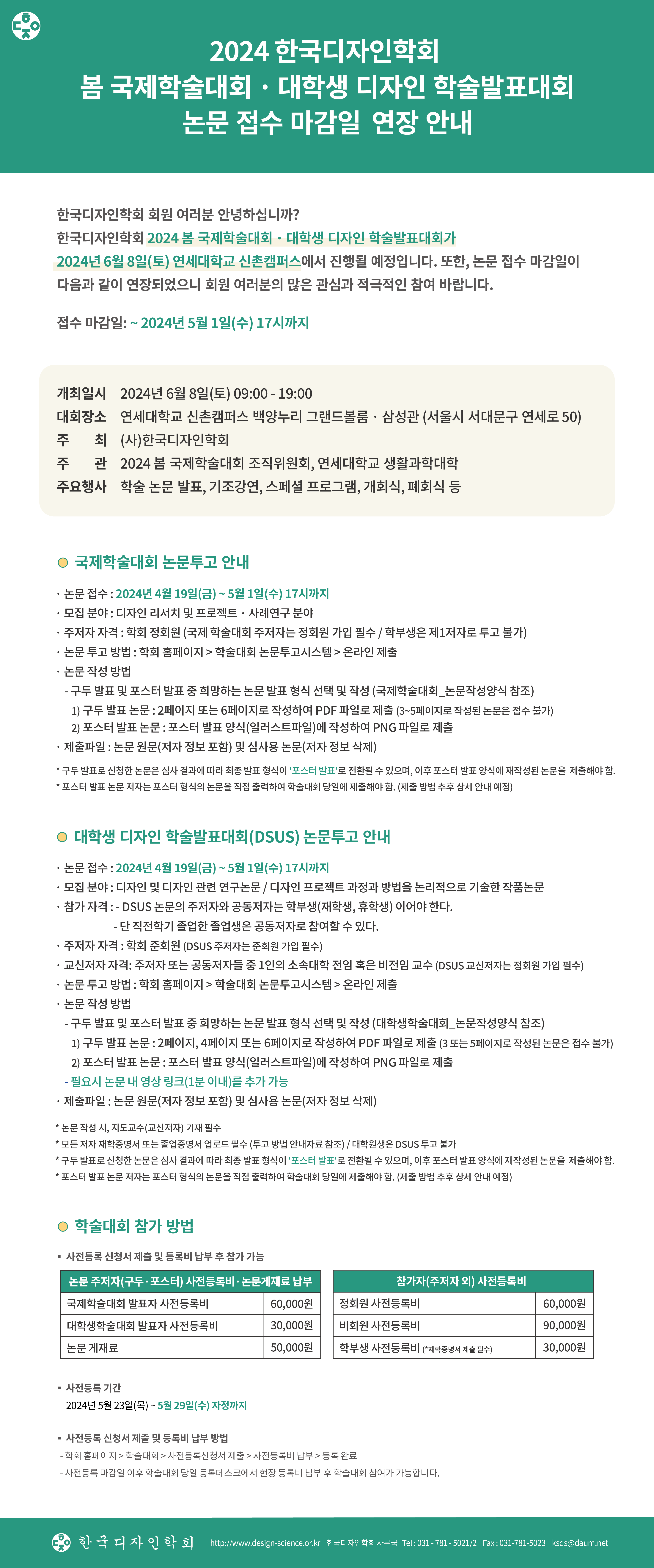 2024 한국디자인학회 봄 국제학술대회 · 대학생 디자인 학술발표대회 논문 접수 마감일 연장 안내(~5/1)