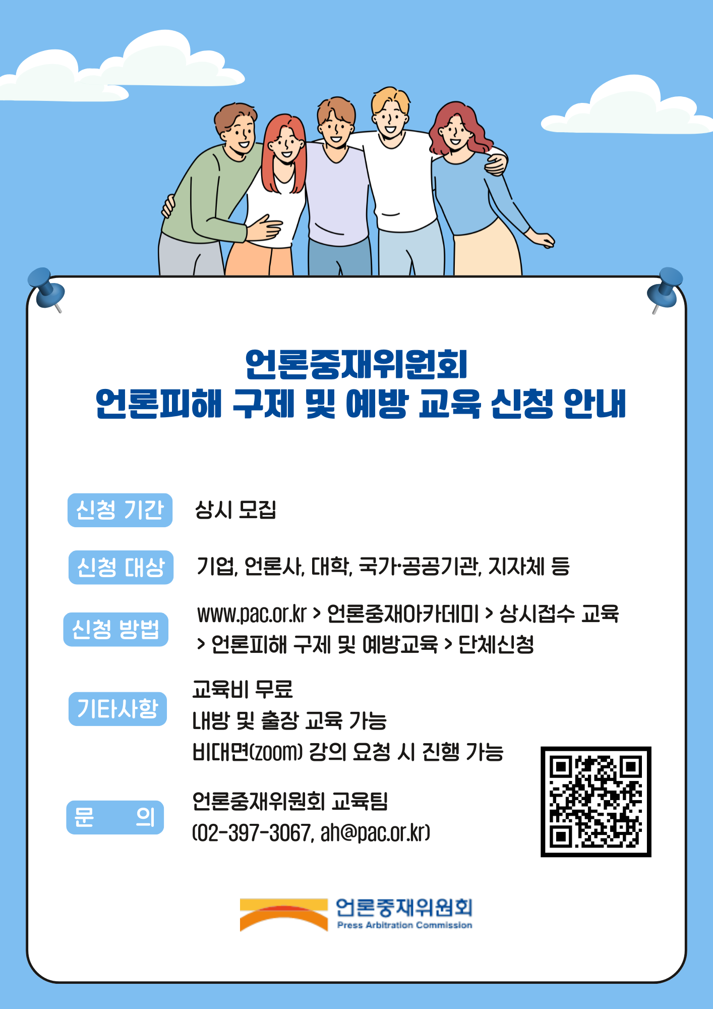 사. 교육문의: 언론중재위원회 연구교육본부 교육팀(02-397-3067). 끝.