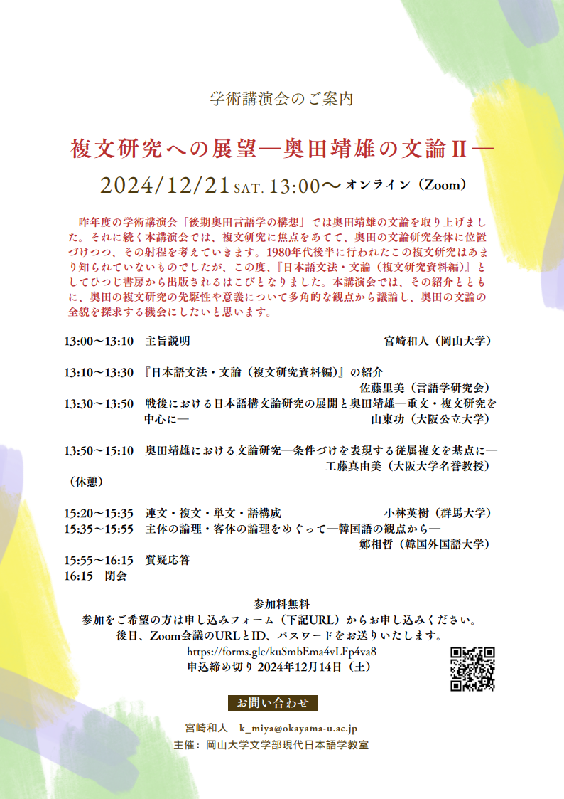 학술강연회 '複文研究への展望 -奥田靖雄の文論Ⅱ-' 안내