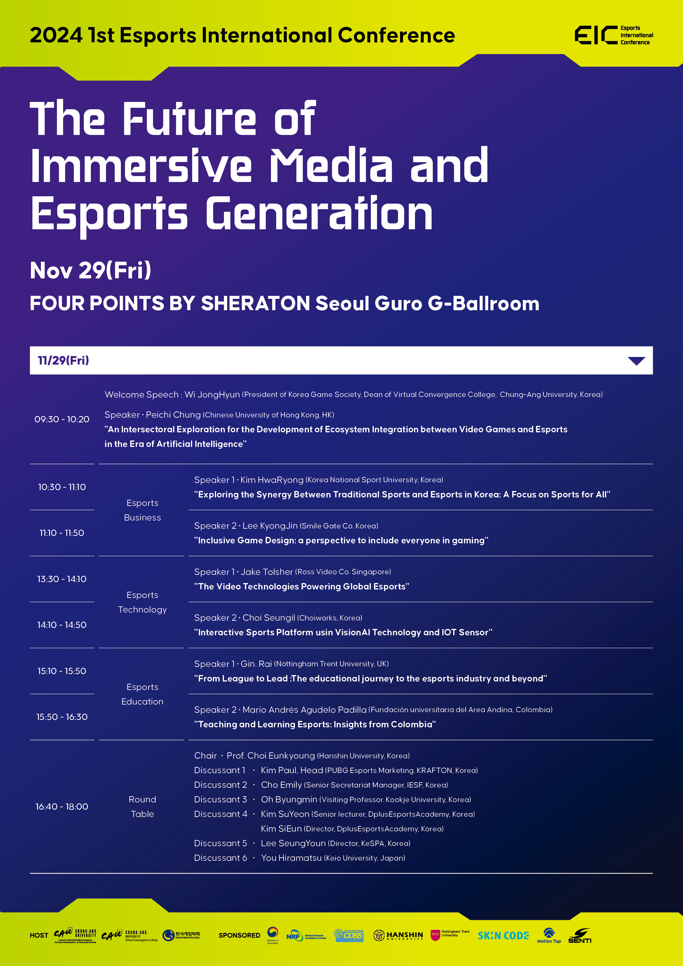이번 학술대회는 ‘실감 미디어와 e스포츠 세대의 미래’를 주제로, 홍콩, 싱가포르, 일본, 영국, 콜롬비아, 한국에서 모인 e스포츠 교육자들과 스마일게이트, 크래프톤, Dplus e스포츠 아카데미, 국제이스포츠연맹(IESF), 한국이스포츠협회(KeSPA) 등 업계 전문가들이 참여해 e스포츠의 비즈니스, 기술, 교육의 현재와 미래를 논의할 예정입니다.