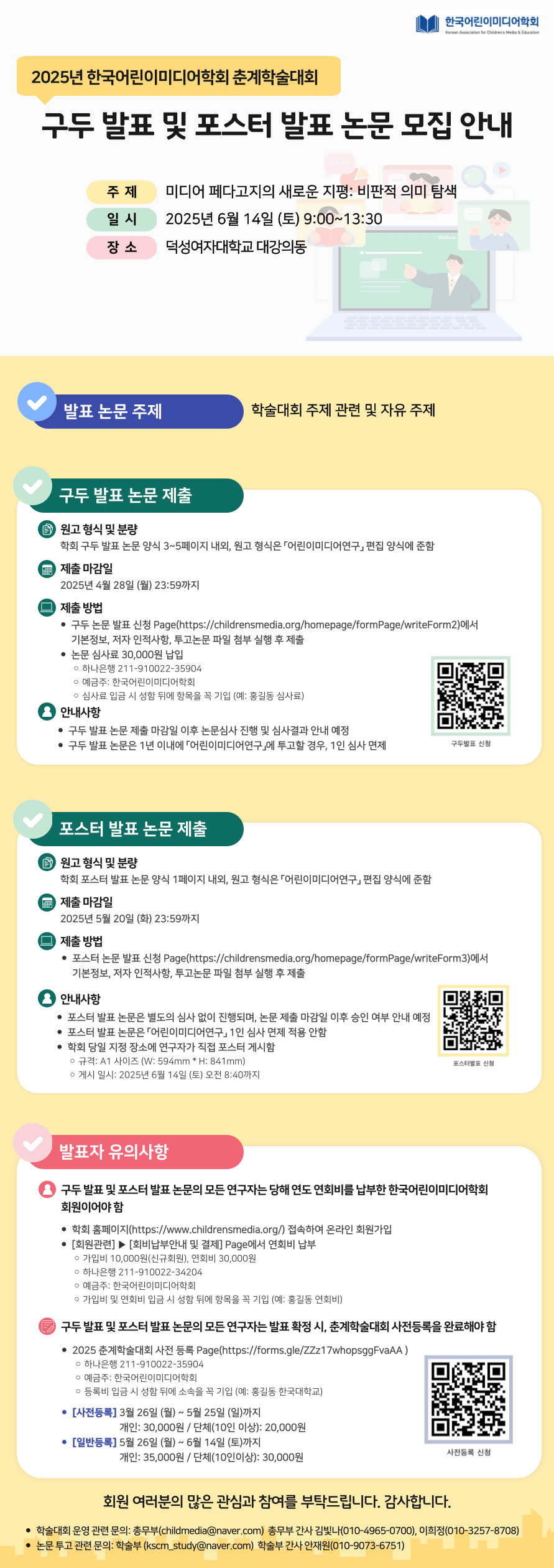 다가오는 2025년 6월 14일(토)에 개최되는 2025년 한국어린이미디어학회 춘계학술대회 구두 발표 및 포스터 발표 논문 모집을 안내해 드립니다.