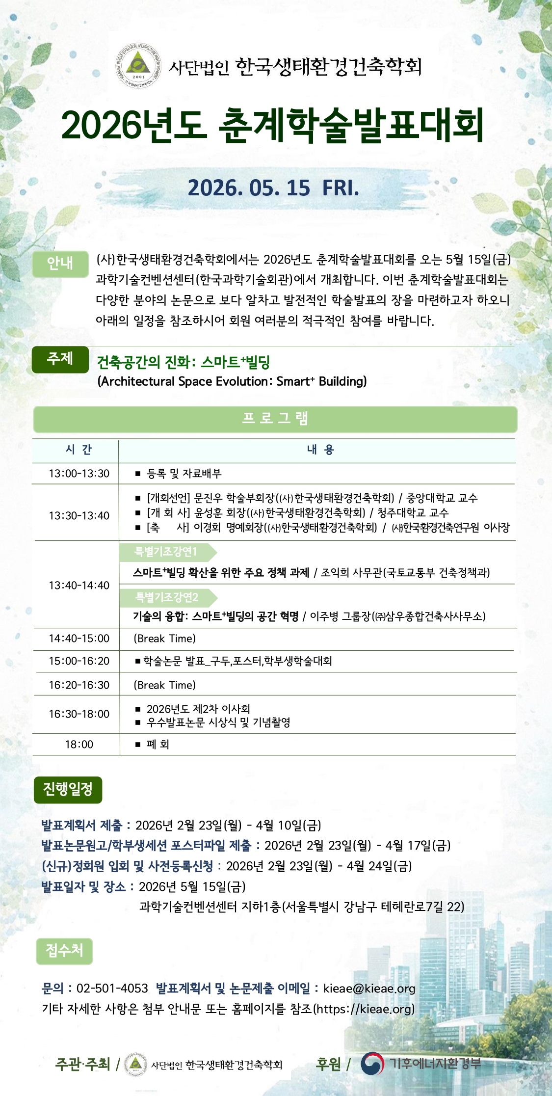 (사)한국생태환경건축학회에서는 2026년도 춘계학술발표대회를 오는 5월 15일(금) 과학기술컨벤션센터(한국과학기술회관)에서 개최합니다. 이번 춘계학술발표대회는 다양한 분야의 논문으로 보다 알차고 발전적인 학술발표의 장을 마련하고자 하오니 아래의 발표논문분야와 일정을 참고하시어 회원 여러분의 적극적인 참여를 부탁드립니다.