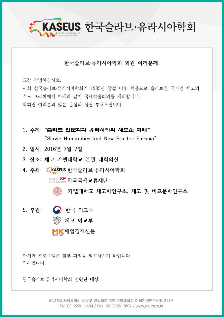 1985년 학회 창설 이후 최초로 체코 프라하에서 개최되는 이번 국제학술회의에 학회원 여러분의 많은 관심과 성원 부탁드립니다.