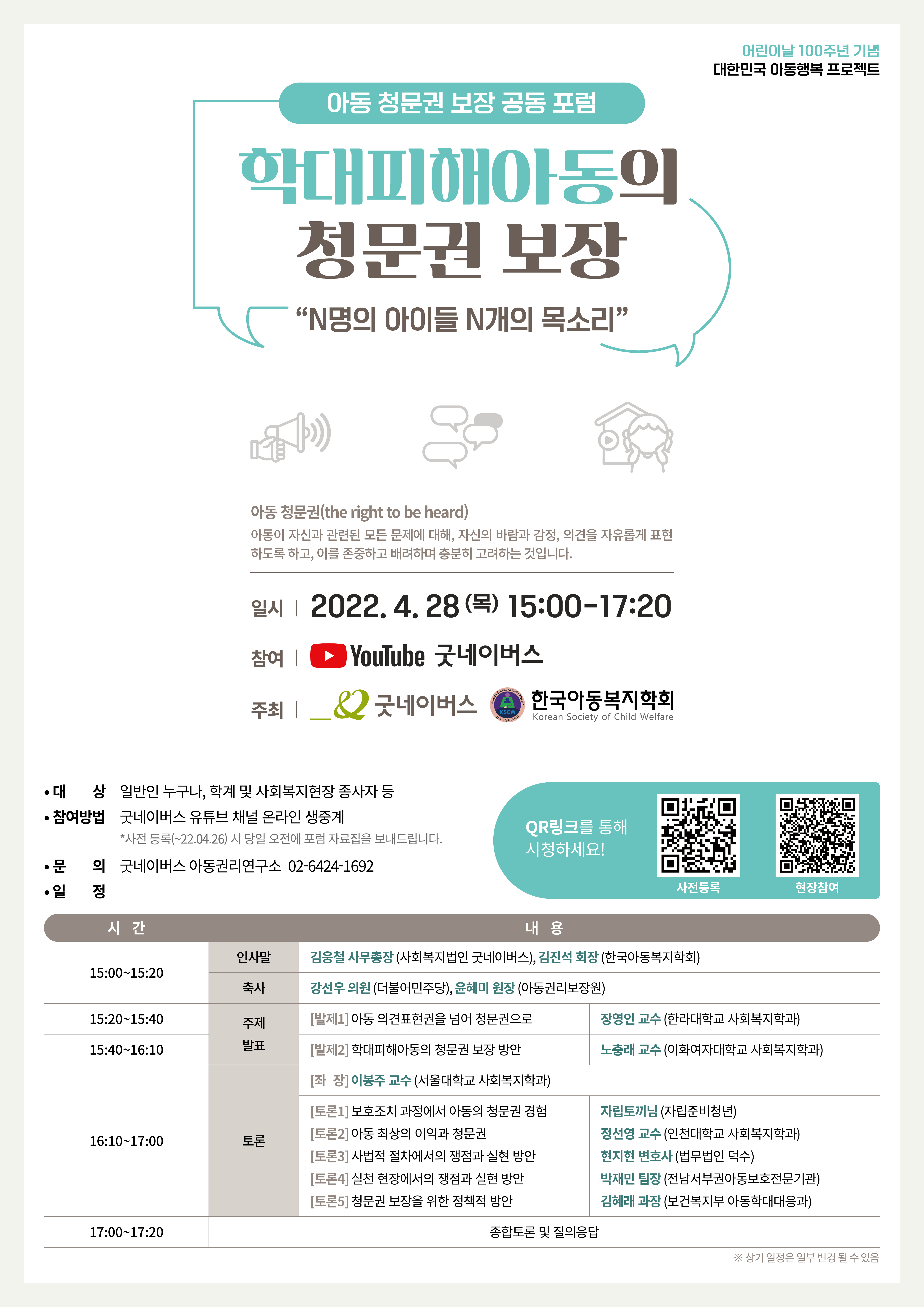 듣도록 요구할 권리인 아동청문권이 아동보호체계 전반(사법, 행정, 실천 현장 등)에서 보장될 수 있도록 구체적인 방안을 모색하고 논의 하고자 마련되었습니다.