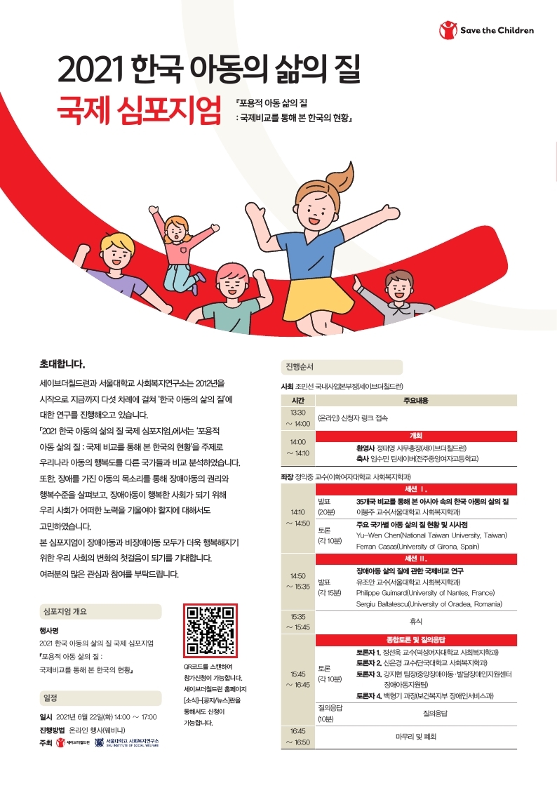 [홍보] 세이브더칠드런2021 한국 아동의 삶의 질 국제 심포지엄 개최 안내 2021.6.22(화) 오후 2시