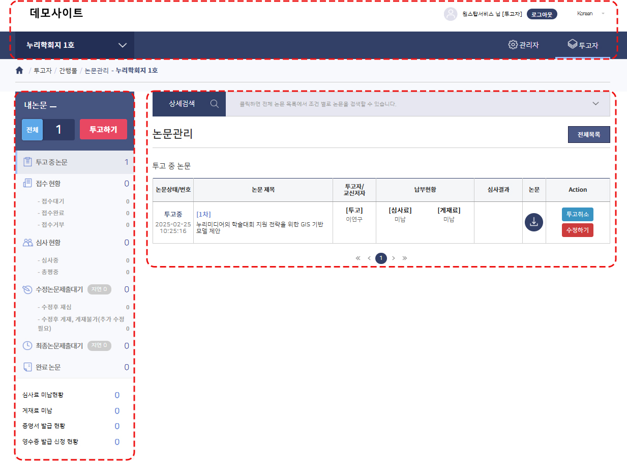 투고자 대시보드는 크게 상단과 논문단계, 논문리스트 세 영역으로 구분할 수 있습니다.