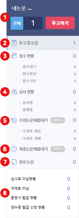 논문상태/번호 논문의 상태와 번호를 조회할 수 있습니다. 논문번호는 접수완료 이후부터 보입니다.