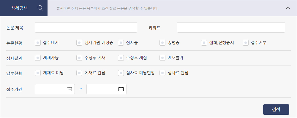 상세검색 상세검색을 클릭하면 창이 활성화되며, 필터를 통해 원하는 논문을 쉽게 찾을 수 있습니다.