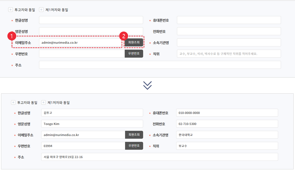 2. 회원만 투고 권한이 있을 때는 가장 먼저 이메일을 입력한 뒤 회원조회 버튼을 클릭합니다.