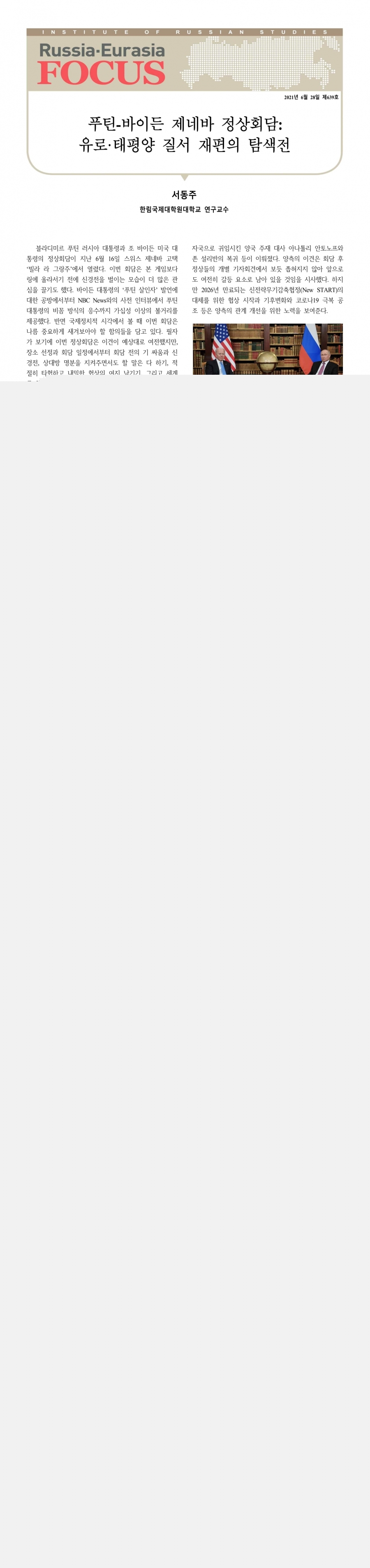 제639호 푸틴-바이든 제네바 정상회담: 유로·태평양 질서 재편의 탐색전
