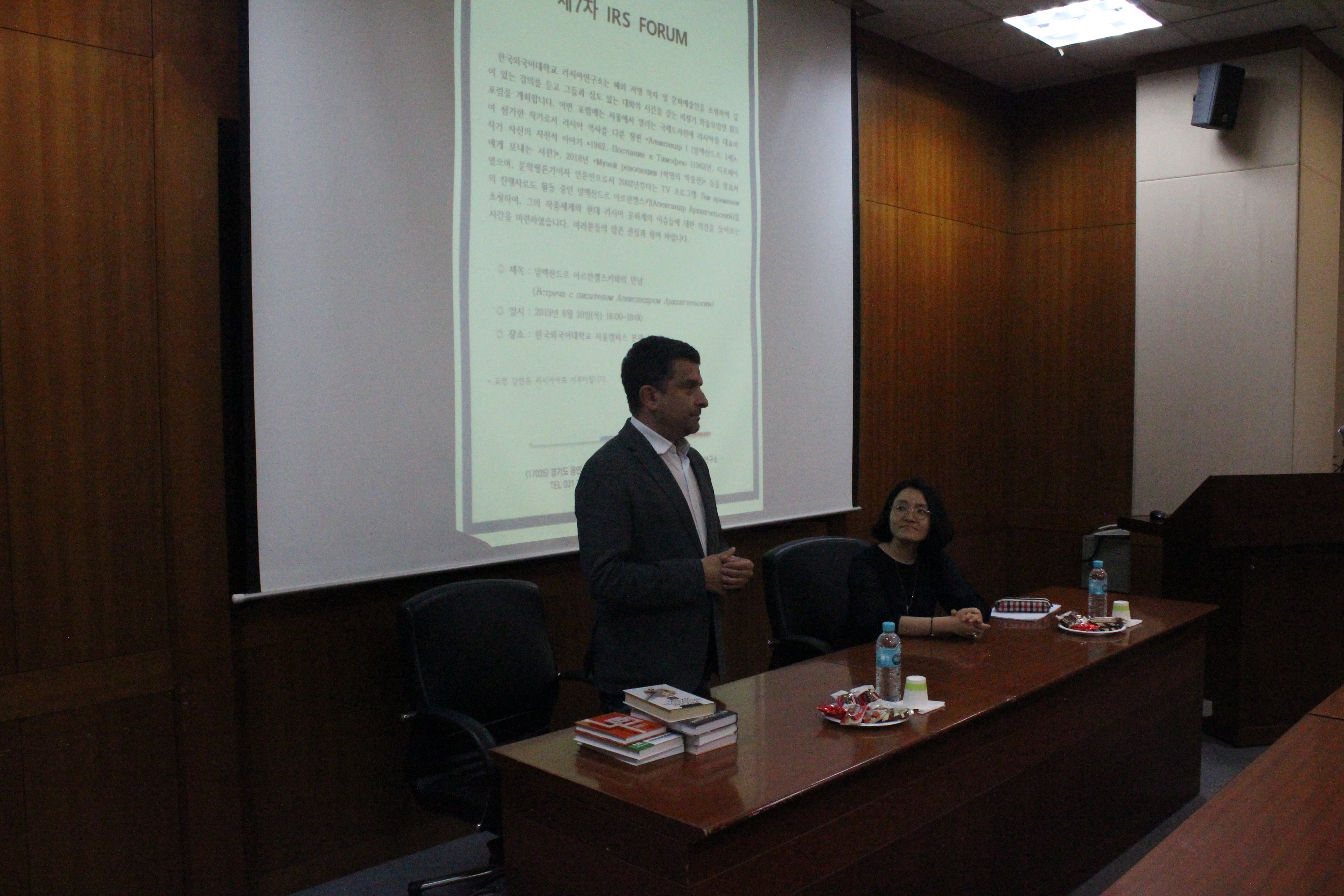 2019 6 20(한국외국어대학교 러시아연구소는 오늘날 러시아의 저명한 작가이자 평론가로 활동하고 있는 알렉산드르 아르한겔스키를 모시고 제7 IRS Forum을 개최했다발표를 통해 알렉산드르 아르한겔스키 작가는 출판된 책을 소개하며 자신과 그의 작품 세계를 설명했고이후에는 청중들의 질문에 답변하며 작가에 대한 궁금증을 풀어줬다.
