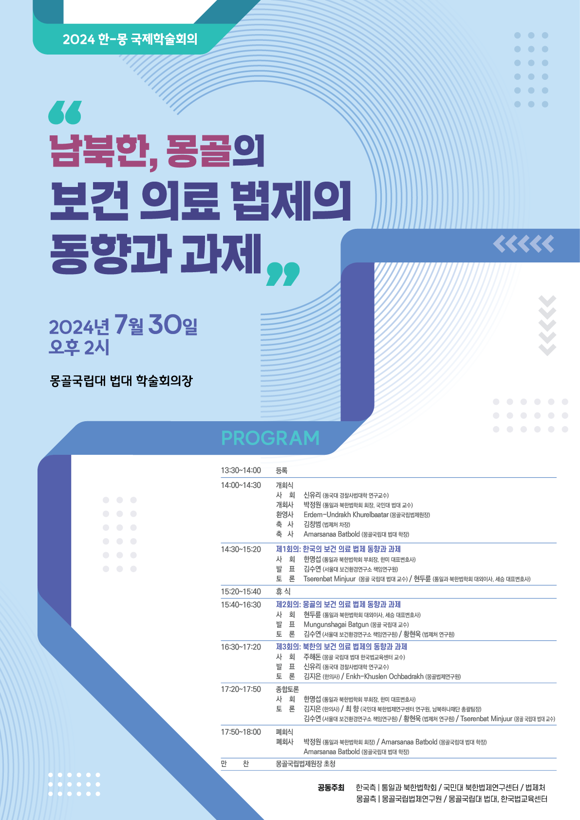 2024년 7월 30일에 '남북한, 몽골의 보건의료 법제의 동향과 과제' 국제학술회의가 몽골국립대학교 법대 학술회의장에서 진행되었습니다.