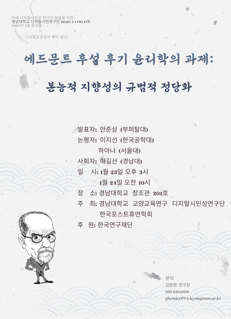 본 연구소는 <디지털시민성 함양을 위한 지역형 인문교양교육 모형 개발 및 확산>이라는 주제로 2021년도 인문사회연구소지원사업에 선정된 바 있습니다. 해당 연구사업의 한 꼭지로 설계된 이 Disputatio는 미래의 디지털시민성 담론을 주도할 신진연구자 발굴을 목표로 합니다. 본 연구단의 핵심 물음인 디지털시민성 함양을 향해, 기초학문분야에서 연구역량이 매우 기대되는 박사과정생이나 혹은 최근에 박사학위를 취득하신 분들이 던져줄 짜릿한 지적 자극을 한껏 기대해봅니다.