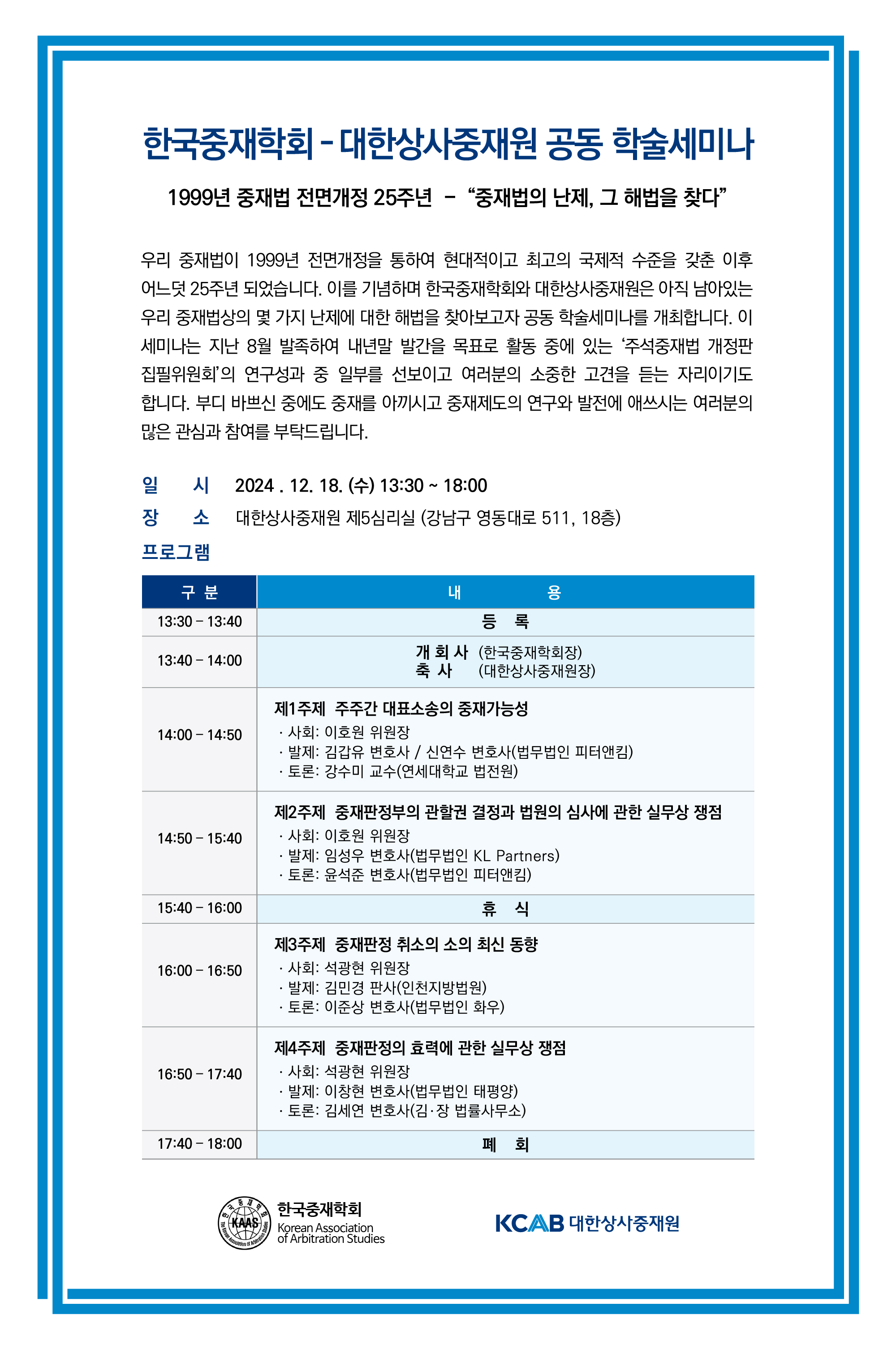 (24/12/18) [한국중재학회-대한상사중재원] 1999년 중재법 전면개정 25주년 공동 학술세미나
