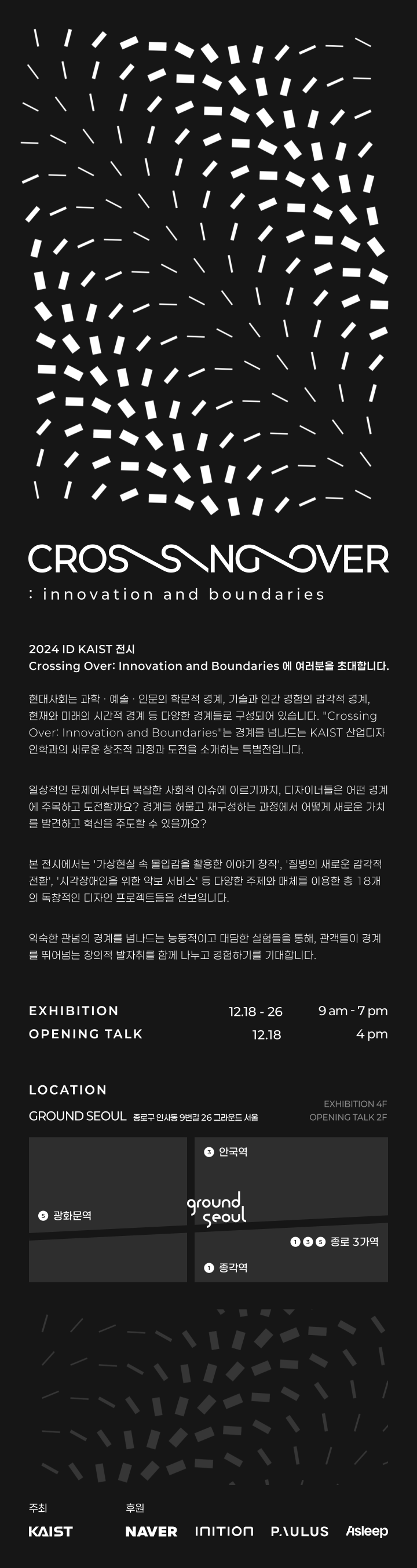 This year, with our exhibition titled "Crossing Over: Innovation and Boundaries," we aim to present the new creative design processes and challenges of ID KAIST.