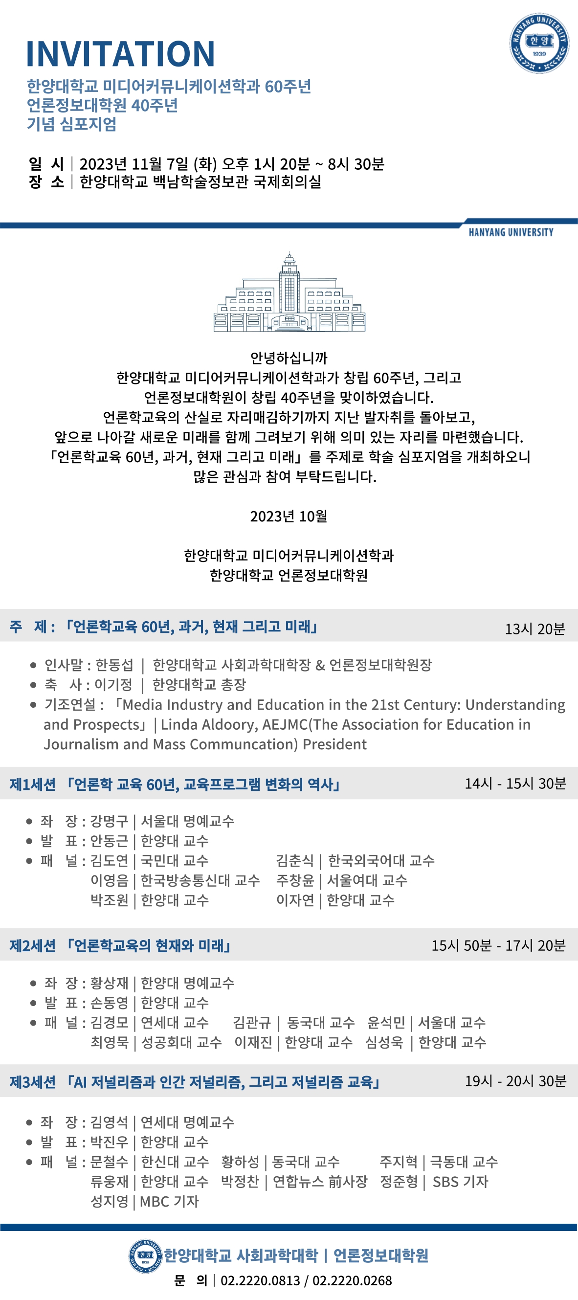 2. 한양대학교 미디어커뮤니케이션학과 창립 60주년, 언론정보대학원 창립 40주년 기념 심포지엄을 개최합니다. 이에 다음과 같이 안내해 드리니 관심 있는 회원님들의 많은 참여 바랍니다.